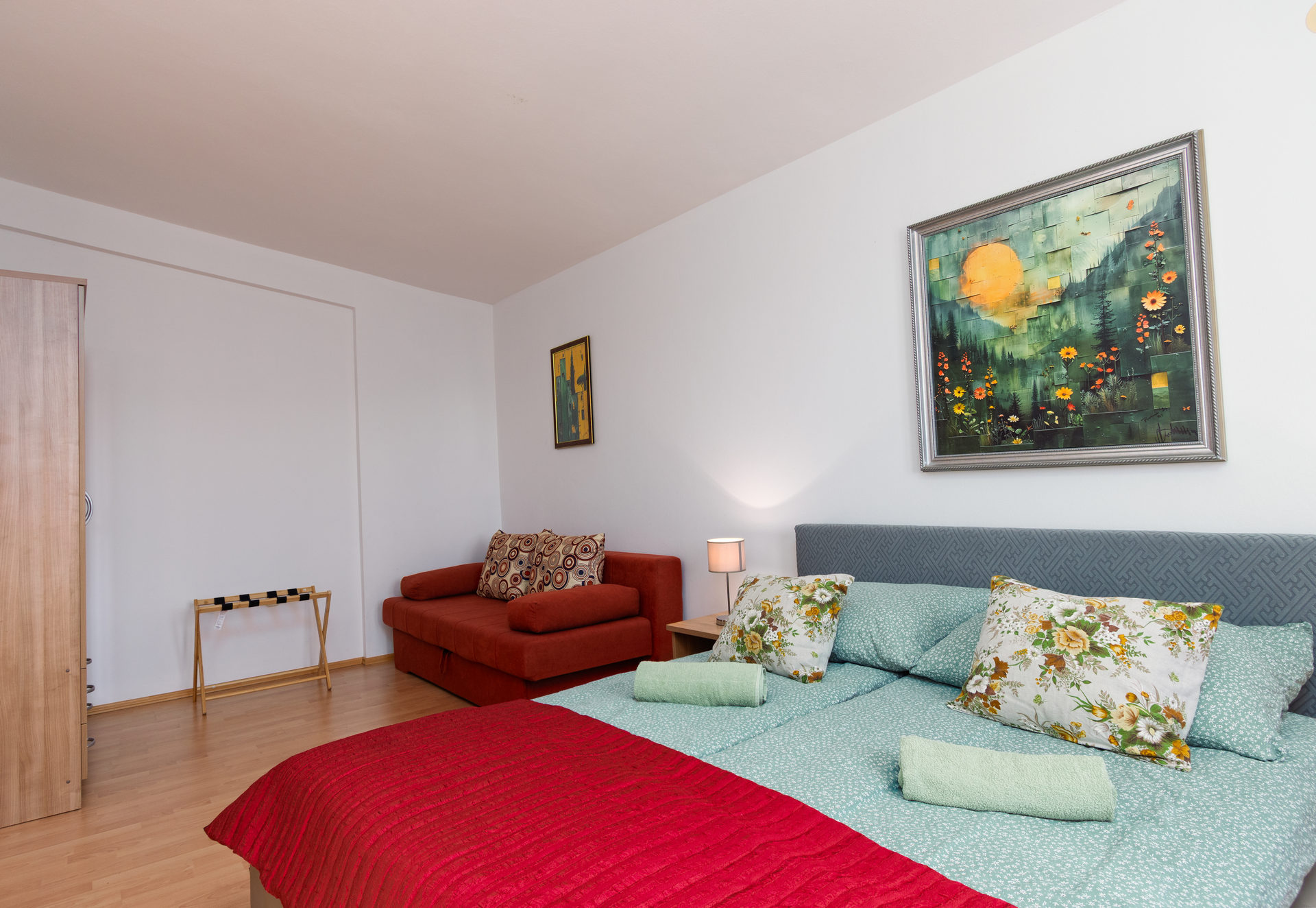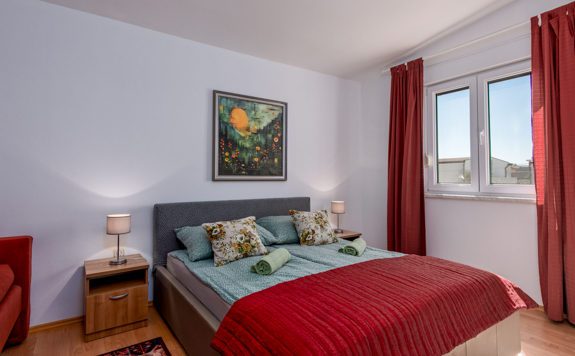 Hálószoba: klíma, 1 franciaágy, 1 kényelmes, kinyitható kétszemélyes kanapé, nagy gardróbszekrény, éjjeliszekrények lámpával.