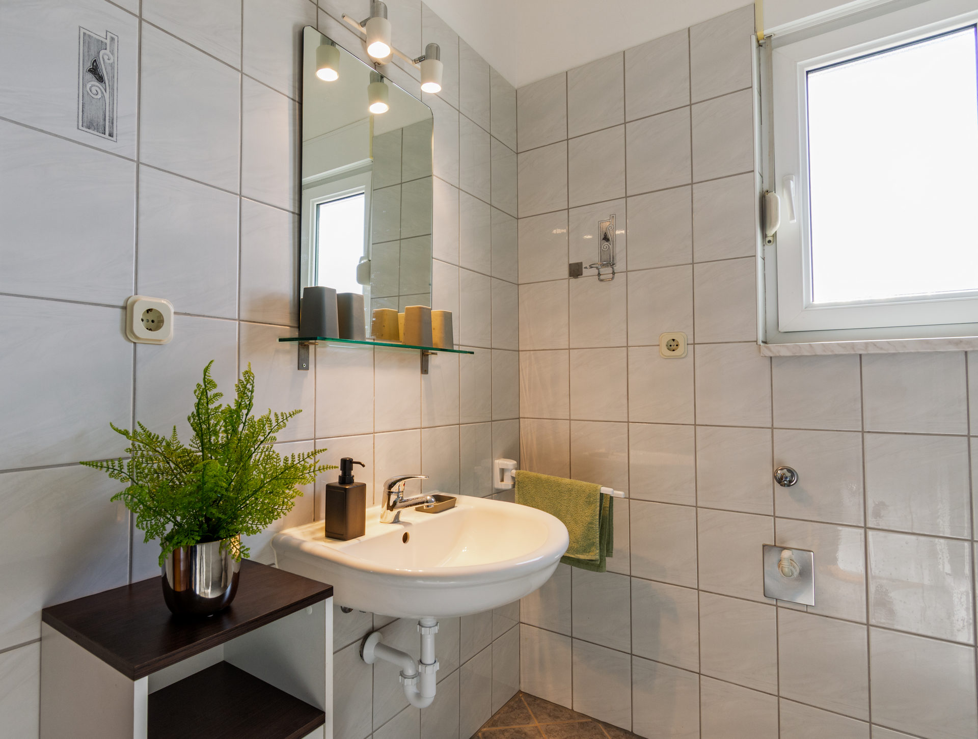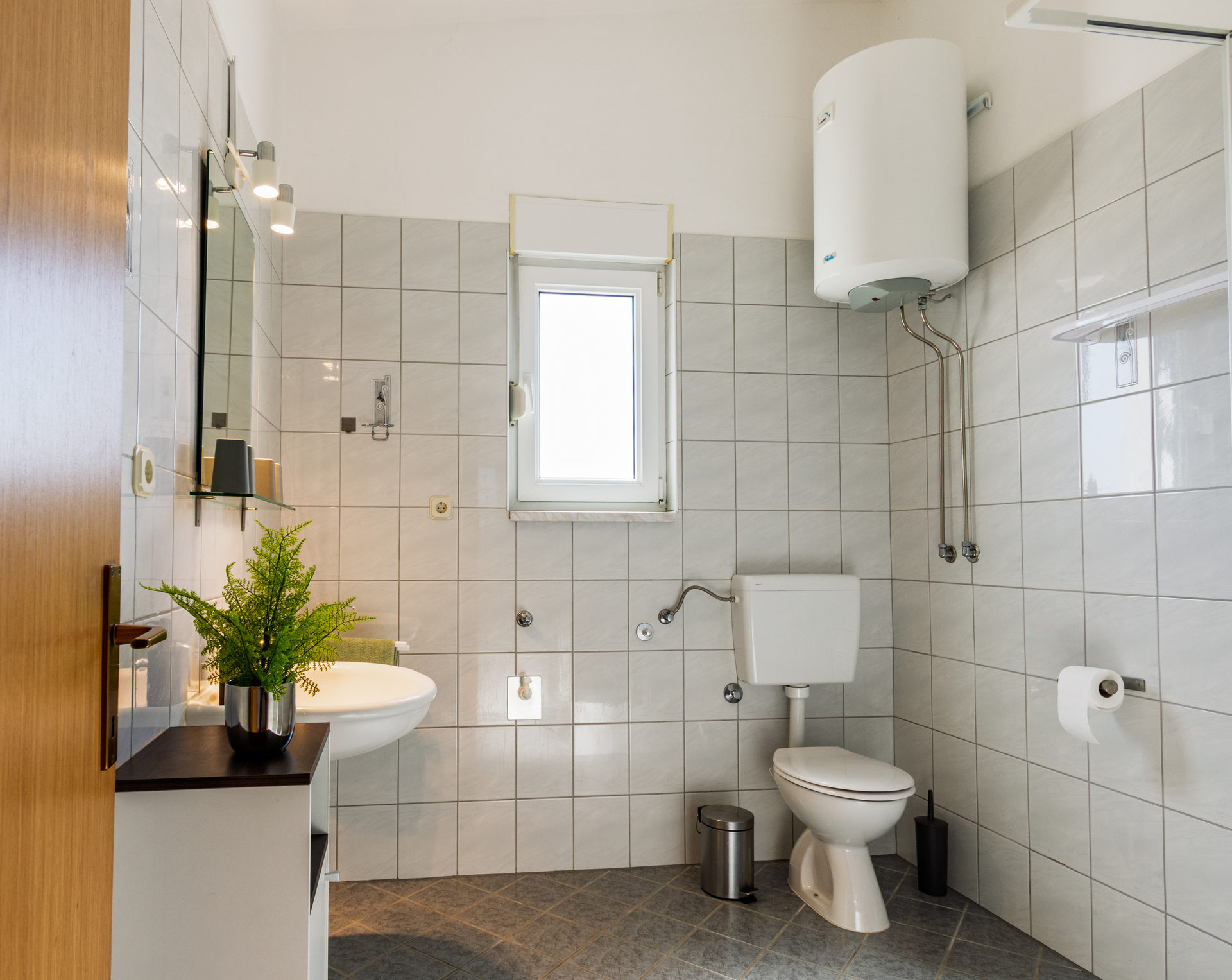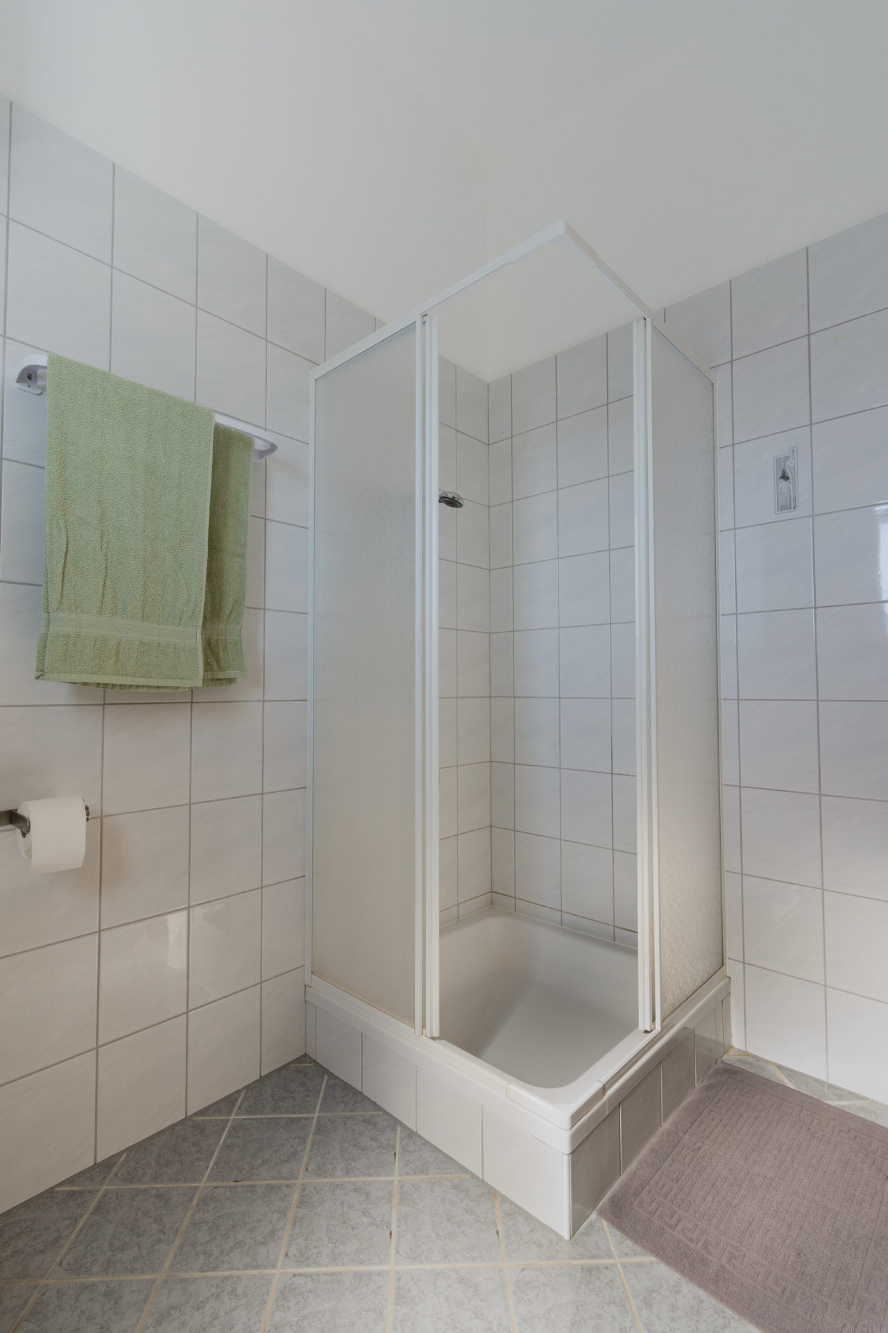 Fürdőszoba: WC, zuhanyzó, mosógép, babakád, folyékony szappan, személyenként egy nagy és egy kis törölköző.